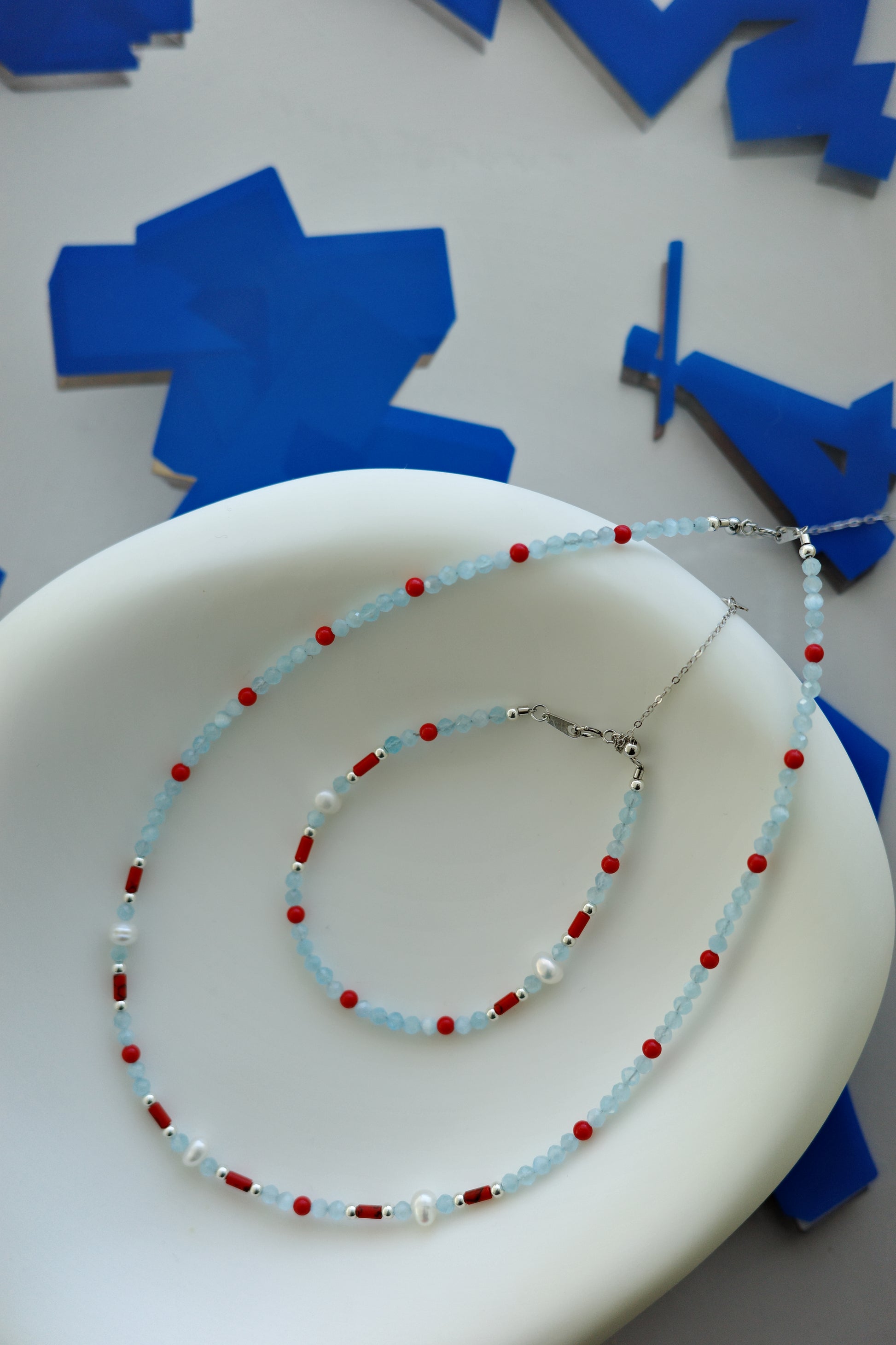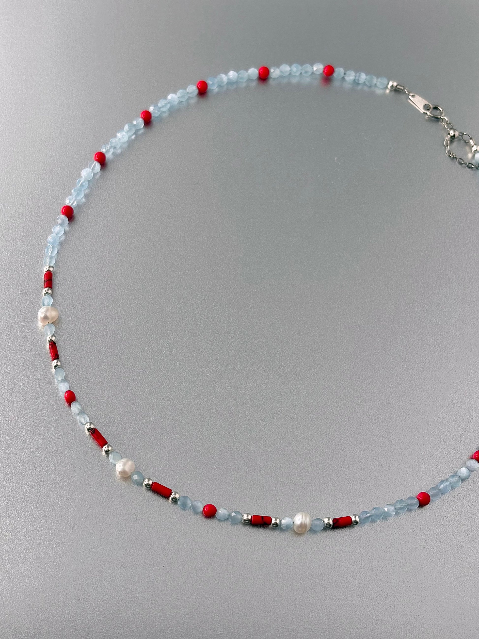 Inspired by coral reefs under morning light, Ocean Coral blends sky-blue crystals, vibrant red beads, and soft freshwater pearls into a rhythmic, sea-touched pattern.