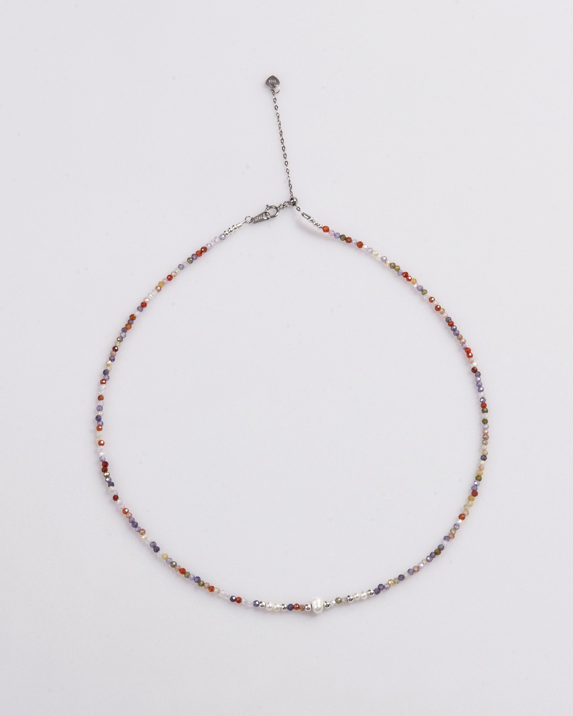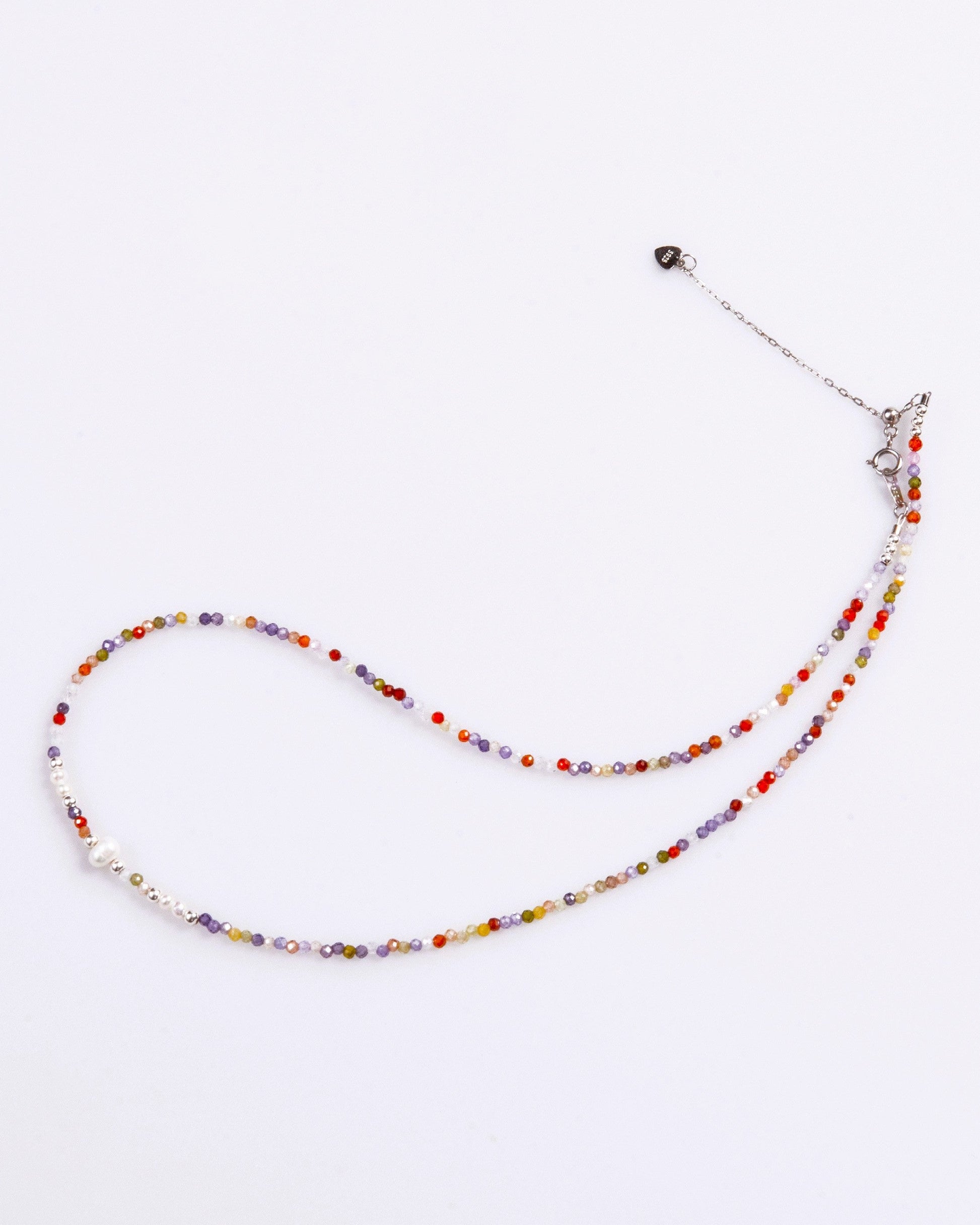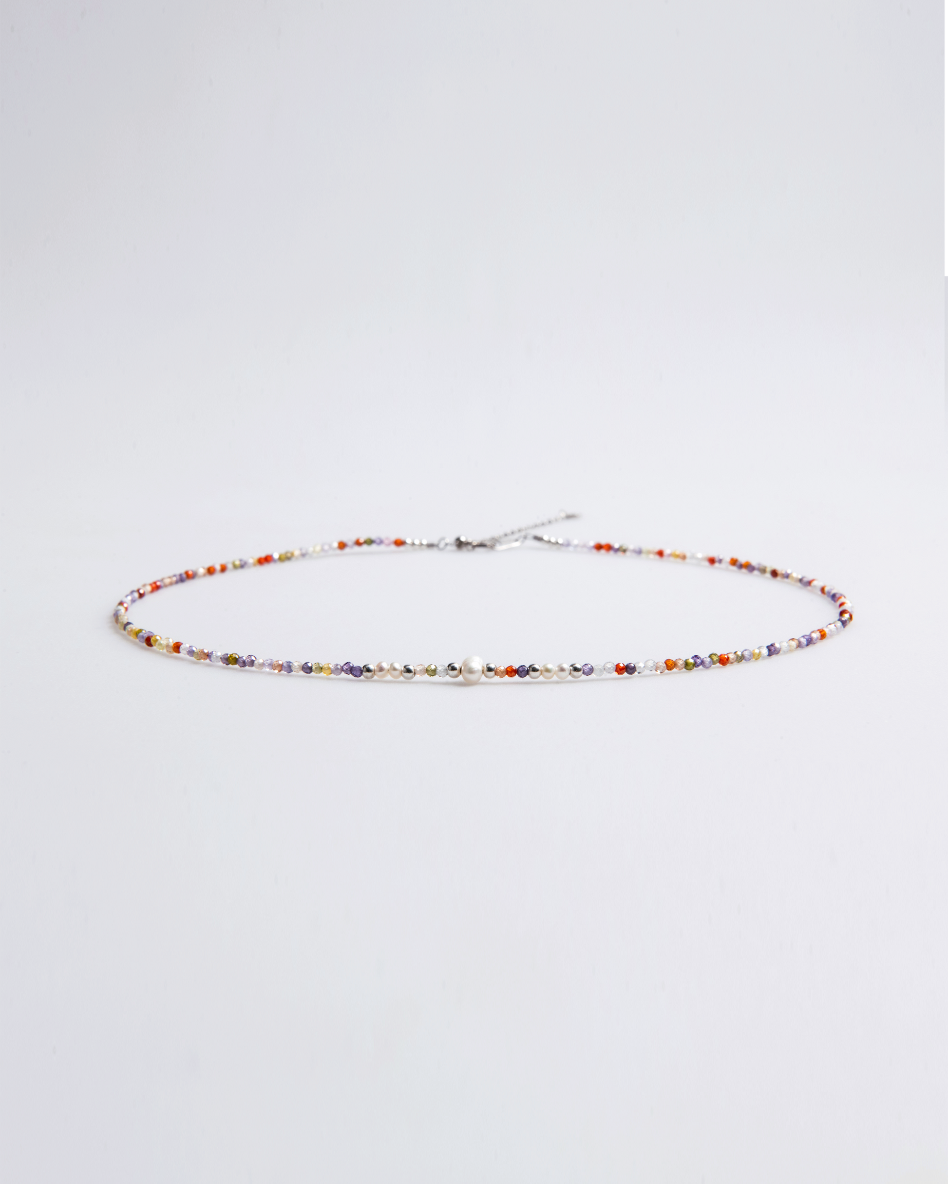 Dayglow is a playful strand of micro multicolor beads, centered by a freshwater pearl — light as air, gentle as color drifting in daylight.