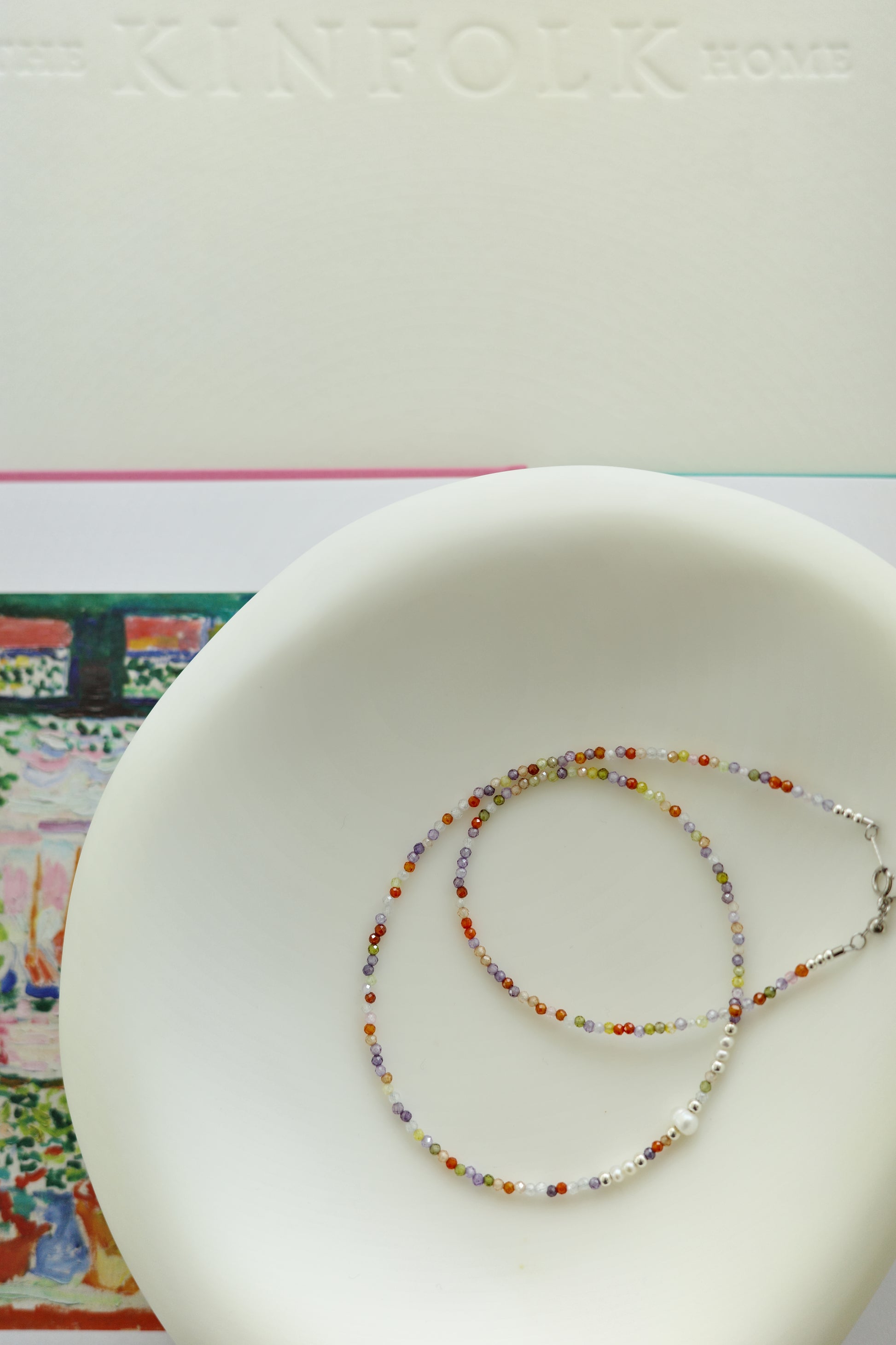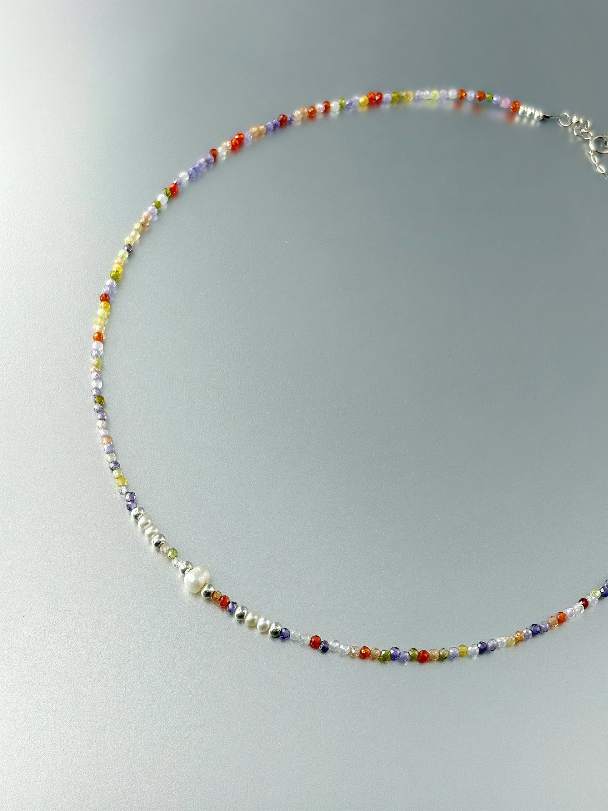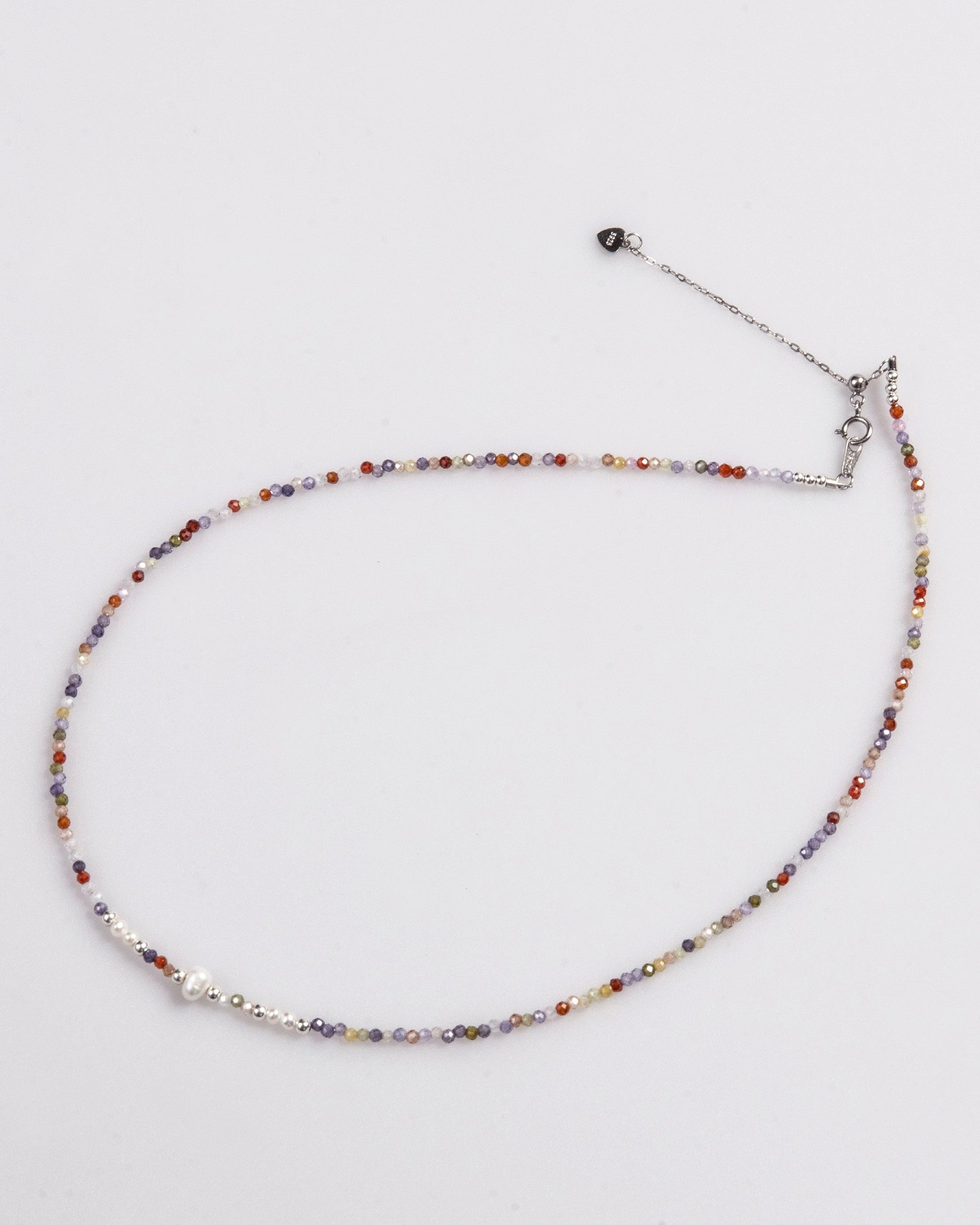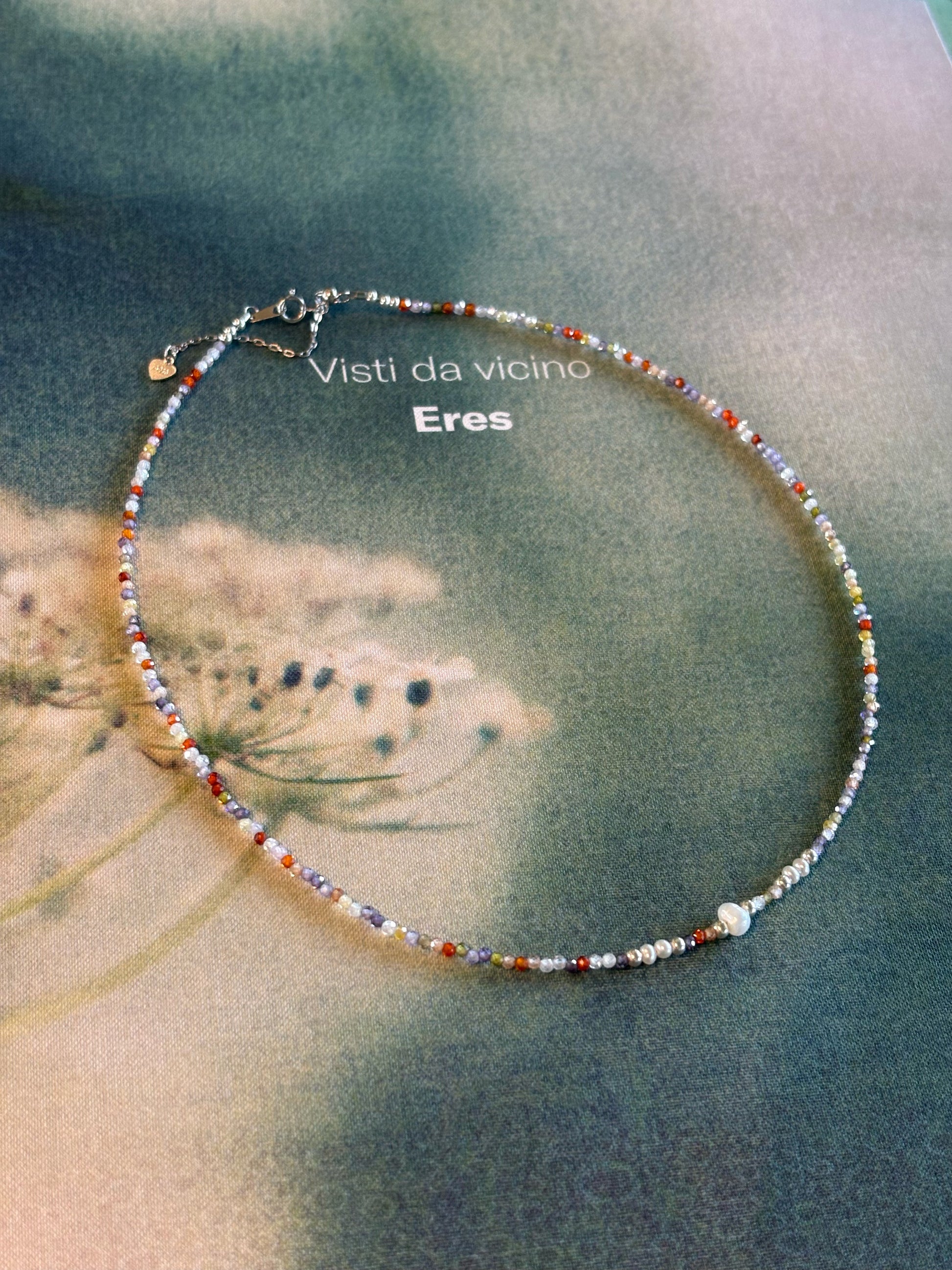 Dayglow is a playful strand of micro multicolor beads, centered by a freshwater pearl — light as air, gentle as color drifting in daylight.