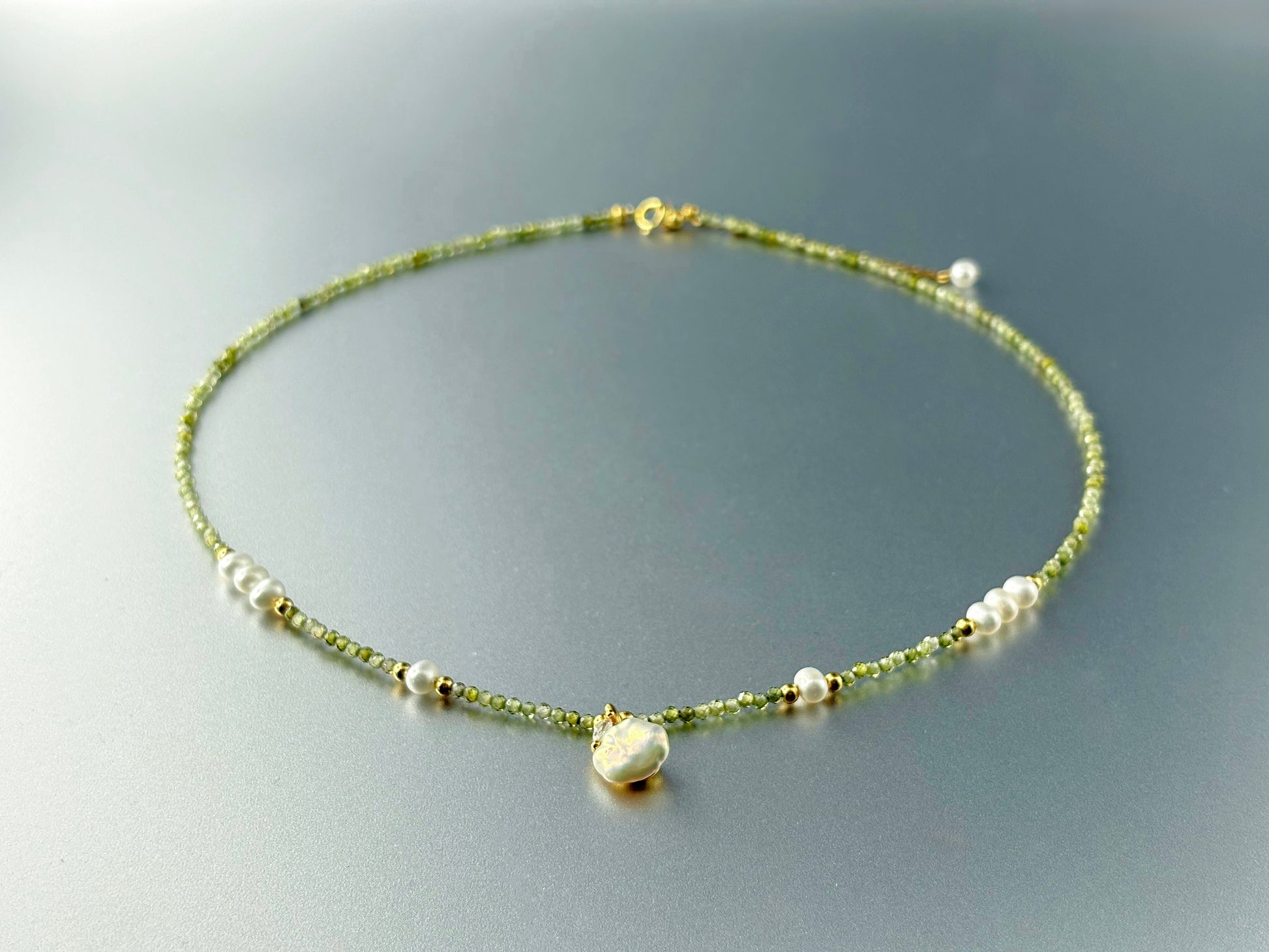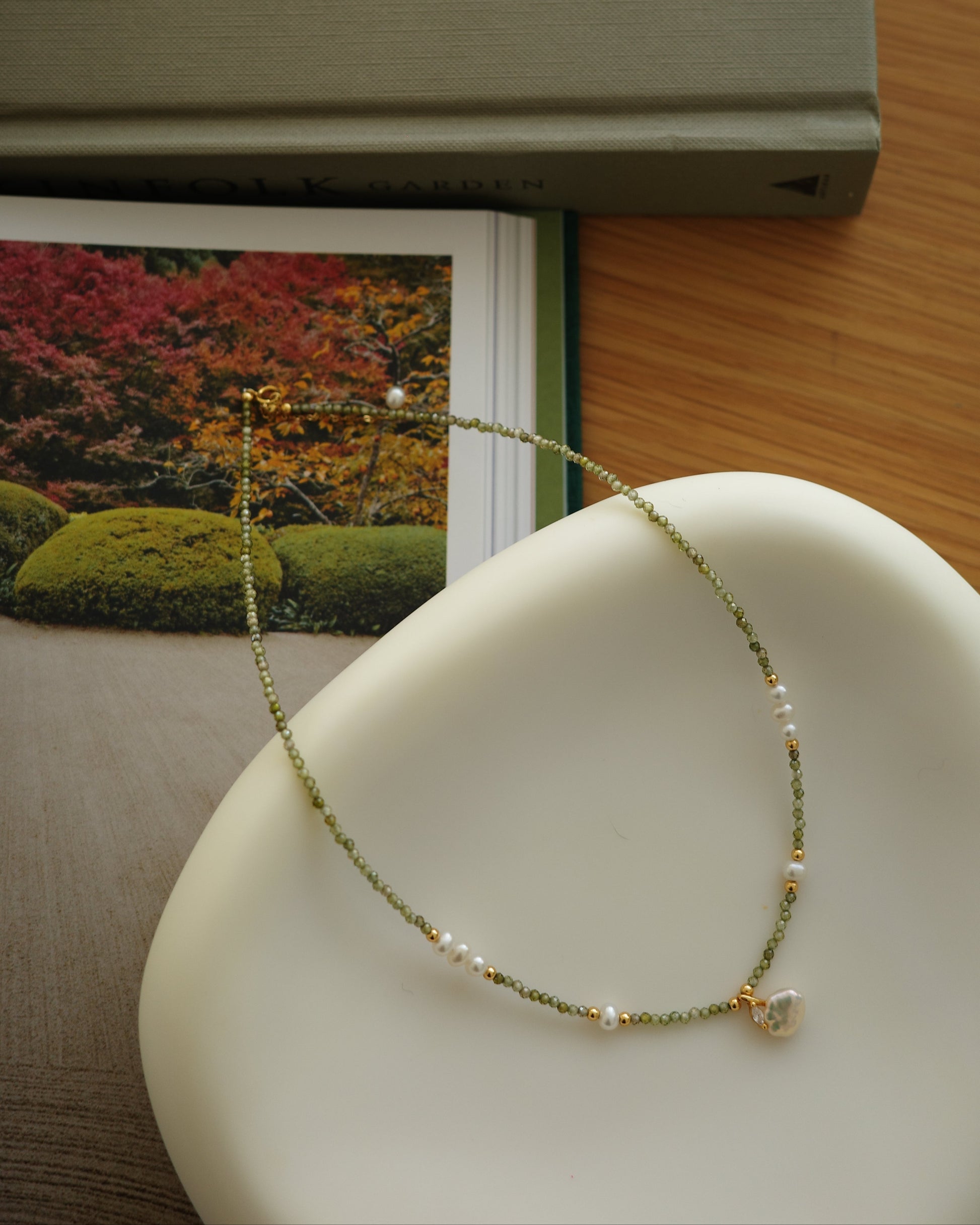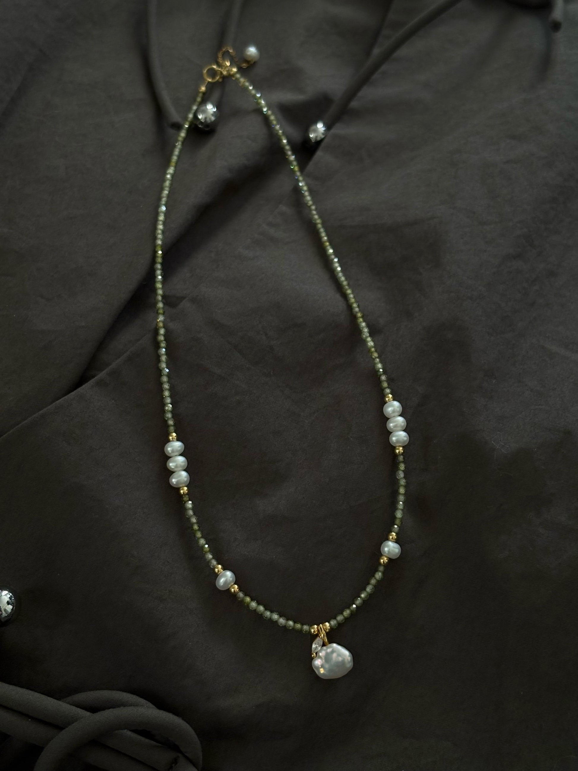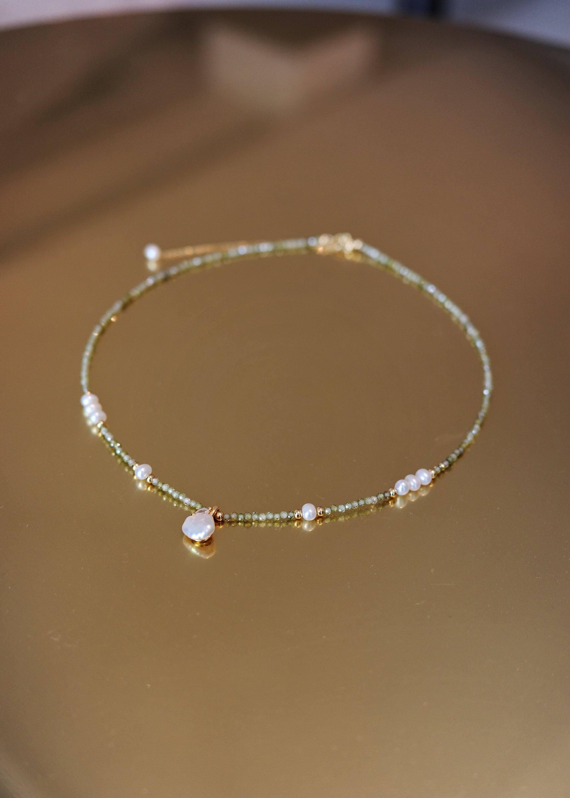 Olive Thread pairs delicate green crystal beads with freshwater pearls and subtle gold accents, creating a gentle rhythm of stillness and glow.